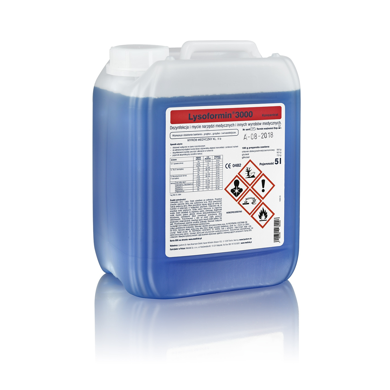 Koncentrat do dezynfekcji sprzętu Lysoformin 3000 Lysoformin 3000 zwalcza bakterie, wirusy, grzyby i inne zanieczyszczenia organiczne. Koncentrat na bazie aldehydu stworzony do mycia i dezynfekcji sprzętu medycznego. Preparat posiada przyjemny zapach oraz substancje zapobiegające korozji. Stosowany w placówkach medycznych, gabinetach fizjoterapeutycznych i stomatologicznych oraz w pomieszczeniach, gdzie występuje ryzyko zakażenia. Powierzchnie i narzędzia poddawane dezynfekcji za pomocą produktu nie ulegają zniszczeniu. Pojemność: 5000 ml Przeznaczenie: dezynfekcja narzędzi